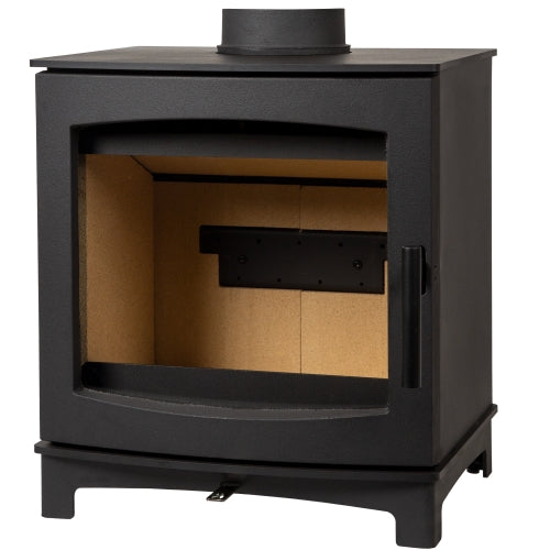 The black steel body incorporating a black cast iron door with elegant discreet black handle comes with a lifetime warranty. The powerful tertiary air system enables a highly efficient burn, which results in a significantly cleaner and more efficient wood burning stove.